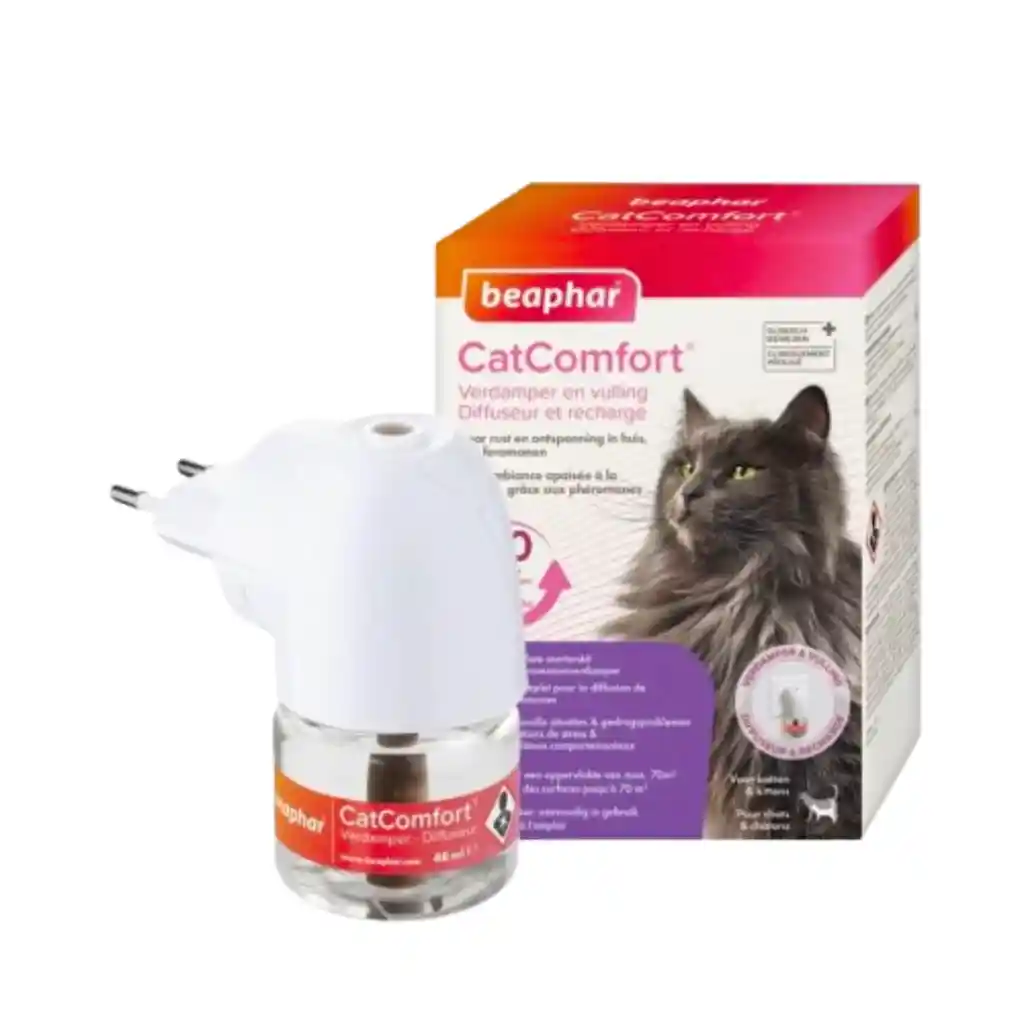 El Beaphar CatComfort Excellence Difusor y Repuesto es la solución perfecta para mantener la calma y la armonía en hogares con gatos. Utilizando una avanzada tecnología de feromonas, científicamente reconocida por sus efectos calmantes, este difusor ofrece un efecto continuo que reconforta a los gatos nerviosos o estresados. ¿Que son las feromonas? Las feromonas son las marcas invisibles que dejan los gatos para expresar que un área es segura y cómoda, y a menudo se asocian con sentimientos de tranquilidad y felicidad. Dejar estas marcas es una manera de que el gato forme una conexión positiva con un objeto o espacio. Cuando un gato se siente cómodo y tranquilo, es menos probable que muestre un comportamiento inapropiado, como arañar o dejar marcas urinarias. Muchos dueños de gatos reconocen este tipo comportamiento, ya que los gatos a menudo se frotan con ellos y con objetos domésticos. Al hacer esto están liberando feromonas y marcando el área u objeto como un “espacio seguro” o identificándote como una persona con la que están cómodos y felices. Al usar las feromonas Beaphar CatComfort está ayudando a su gato a indicarle que se encuentra en un ambiente seguro y cómodo para él, reduciendo así problemas de comportamiento en el hogar. El estrés prolongado en los gatos puede provocar una enfermedad crónica. Es importante que los propietarios hagan todo lo posible para ayudar a su gato a sentirse tranquilo y libre de estrés, especialmente en épocas de fiestas, fuegos artificiales, mudanzas o la introducción de una nueva mascota o miembro de la familia. Características Tecnología avanzada de feromonas: Utiliza una combinación de feromona facial felina (FFP) y feromona apaciguadora materna (MAP) para un efecto calmante continuo. Reducción de comportamientos no deseados: Ayuda a disminuir maullidos excesivos, marcaje urinario, arañazos y lamido excesivo. Alivio de la ansiedad: Ideal para situaciones estresantes como ansiedad por separación, fuegos artificiales, visitas familiares, y otros cambios en el entorno del gato. Promueve la armonía en hogares con varios gatos: Fomenta la convivencia pacífica y el vínculo positivo entre gatos en el mismo hogar. Fácil de usar: Difusor enchufable que puede colocarse en cualquier área de la casa. Duración prolongada: Proporciona hasta 30 días de efecto calmante continuo con un uso regular antes de necesitar un recambio. Adecuado para gatos de todas las edades: Eficaz para gatos jóvenes, adultos y mayores. Seguro y natural: Reproduce feromonas naturales que los gatos ya reconocen y que no tienen efectos secundarios conocidos. Cobertura amplia: Efectivo en un área de hasta 70 m², adecuado para la mayoría de los hogares. Sin fragancia perceptible: No emite olores que puedan interferir con el ambiente del hogar. Composición Análogo de feromona facial felina F3, Análogo de feromona apaciguadora materna, Hidrocarburo isoparafínico qs.