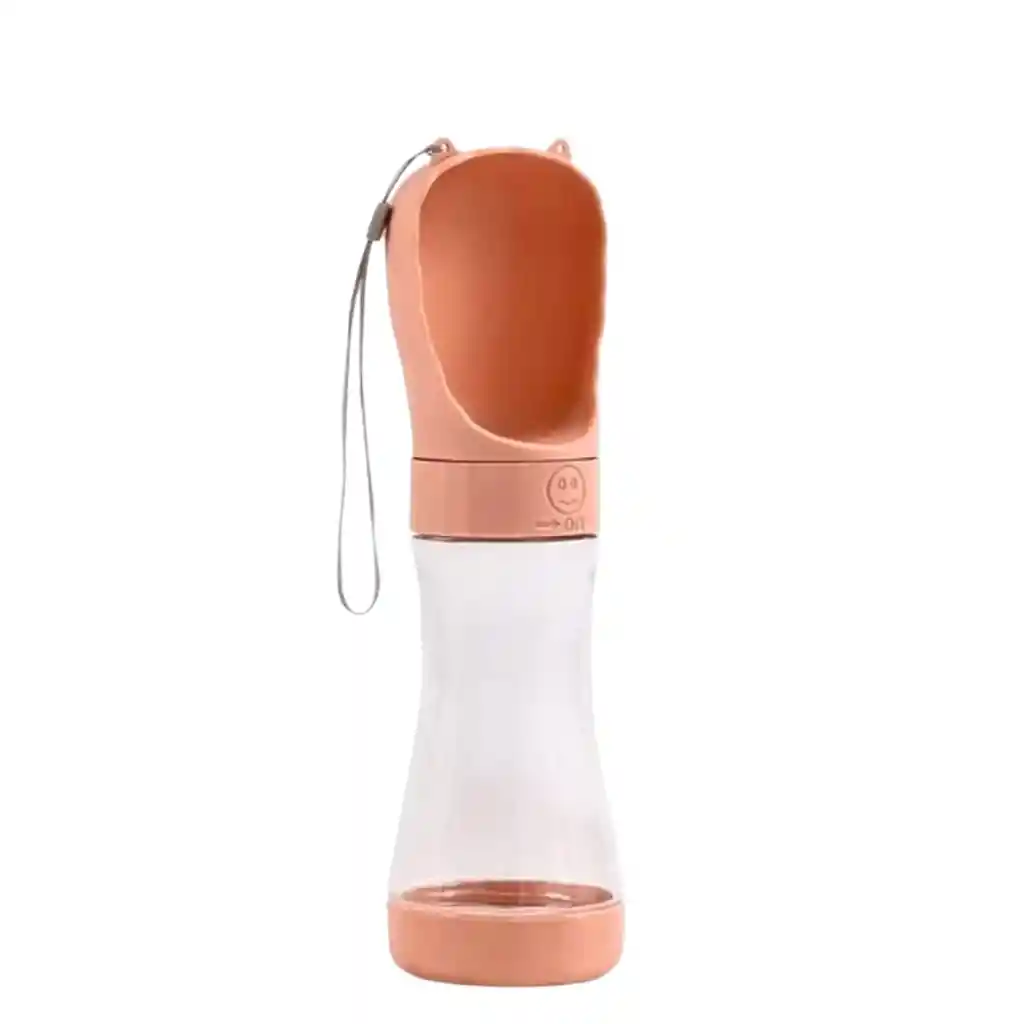 Este tipo de botella de agua está diseñado para que las mascotas puedan beber fácilmente durante paseos o viajes. Está fabricado con plástico resistente y seguro para mascotas. Cuenta con un sistema de dispensación de agua que se activa con un botón, permitiendo que el agua fluya hacia un recipiente integrado. Tiene un diseño a prueba de fugas para evitar derrames. Capacidad de agua de 350 ml Además contiene un recipiente para alimento o snack de 170 ml Incluye una cuerda o asa para facilitar su transporte. Color: Rosado
