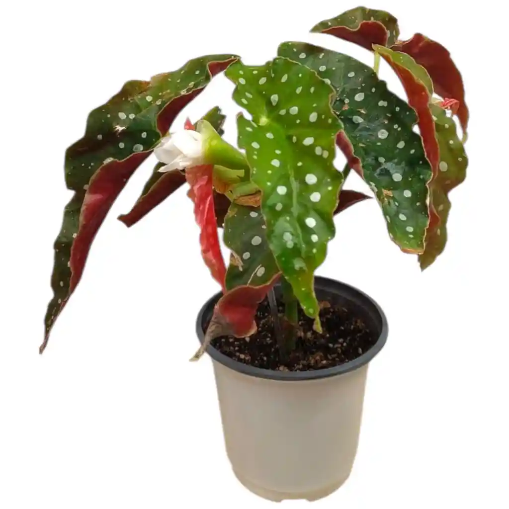 Begonia Maculata. \n \¿Buscas una pieza que robe todas las miradas? La Begonia Maculata es, sin duda, una de las plantas de interior más fotogénicas del mundo. Con sus hojas en forma de ala de ángel, un verde oliva profundo salpicado de lunares plateados y un envés de un rojo burdeos intenso, es puro arte natural. \n \nGuía Rápida de Cuidados: \n \nLuz: Prefiere luz brillante e indirecta; evita la luz solar directa ya que puede quemar las hojas. \n \nRiego: Es importante regar cuando la primera capa del sustrato esté seca. \n \nHumedad: Lo ideal para todas las plantas tropicales tener un 60% de humedad como promedio. \n \nTip Plantlovers: ¡Entrégale un tutor, dale soporte y verás cómo te regala hojas grandes y hermosas!. \n \n \nPlanta tóxica, no es Petfriendly 🐶🐱