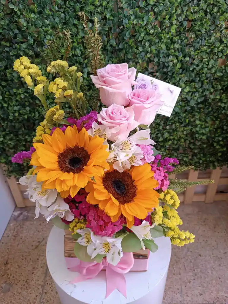 Arreglo con base de madera compuesto por 2 girasoles y 3 rosas rosadas con flores complementarias de temporadas y follaje verde.