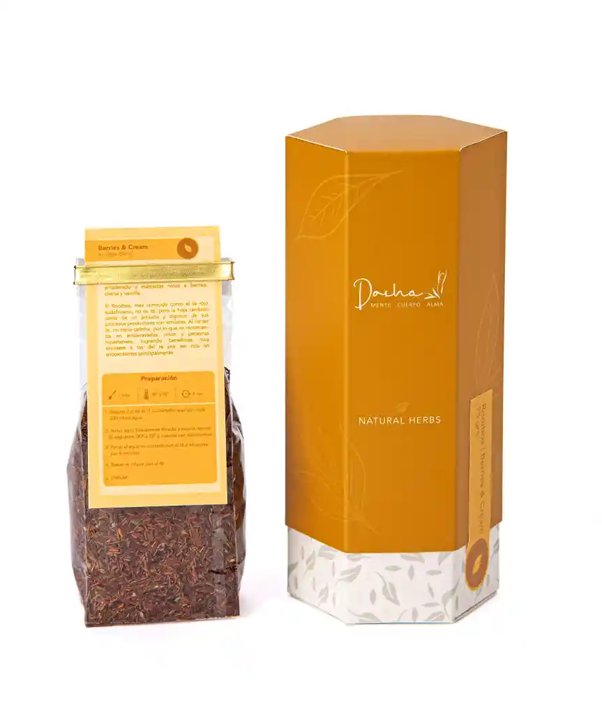Rooibos de Frutillas con Crema Descubre la perfecta armonía de sabores con nuestro Berries & Cream, te transporta a un mundo de indulgencia y placer con su irresistible combinación de sabores. El rooibos proporciona una base dulce y terrosa, mientras que los trozos de frutilla y vainilla añaden un toque de frescura y cremosidad. Las notas vibrantes de berries se entrelazan con el suave aroma a crema y vainilla. Con una base de sabor dulce y levemente amaderado, este blend cautiva con sus marcadas notas a berries, crema y vainilla, creando una experiencia de sabor deliciosa y reconfortante. Beneficios para la Salud del Rooibos de Frutillas con Crema: ✓ Fortalece Dientes, Huesos y Mejora la Piel: El rooibos es rico en minerales como calcio, magnesio y zinc, que contribuyen a fortalecer dientes y huesos, y a mejorar la salud de la piel. ✓ Equilibra el Sistema Nervioso y es Remineralizante: El rooibos ayuda a equilibrar el sistema nervioso, promoviendo la relajación y reduciendo el estrés. Además, su contenido mineral contribuye a remineralizar el cuerpo, fortaleciendo su estructura interna. ✓ Retarda el Envejecimiento Celular: Los antioxidantes presentes en el rooibos ayudan a combatir los radicales libres, retardando el proceso de envejecimiento celular y promoviendo una piel más joven y saludable. ✓ Aumenta la Inmunidad del Cuerpo y Reduce Niveles de Estrés y Ansiedad: El rooibos fortalece el sistema inmunológico, ayudando al cuerpo a defenderse contra enfermedades. Además, su efecto calmante ayuda a reducir los niveles de estrés y ansiedad, promoviendo una sensación de bienestar y equilibrio. Maridaje: Se combina bien con platos como salmón a la parrilla con salsa de vainilla y miel, pollo al curry con leche de coco y jengibre, estofado de ternera con canela y tomates, y tacos de camarones con salsa de mango y cilantro. Ensaladas como espinacas con peras, nueces y queso azul, ensalada de repollo con manzana y almendras, y ensalada de betarraga asada con queso de cabra y nueces, y postres como cheesecake, brownies de chocolate negro y avellanas, y galletas de avena com miel y nueces. Momento de Consumo: El Rooibos de Frutillas con Crema (Berries & Cream) es perfecto para disfrutar en una tarde soleada o como un postre exquisito después de una cena especial. Su sabor dulce y afrutado lo hace ideal para un momento relajante en cualquier momento del día.