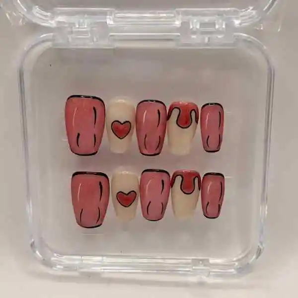 Uñas hechas a mano en tonos vino y rosa escarchado con destellos metálicos. Forma:Coffin, Talla: L Kit Incluye: 10 uñas, 24 stickers, lima, palo de cuticula, alcohol pad. 100% veganas, libres de crueldad animal, listas en 10min y duran hasta 2 semanas.