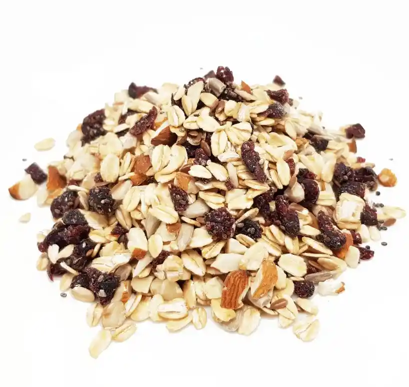 Muesli de avena integral, cranberries, almendras laminadas, chía y linaza. Muesli es una palabra de origen suizo-alemán que se significa "papilla de cereales". Esta mezcla de cereales, frutos secos, semillas y frutas deshidratadas es ideal para consumir con leche, yogurt o bebidas vegetales al desayuno o para preparar tu propia granola casera. ¡Una explosión de nutrientes y sabores para comenzar una mañana llena de energía junto a Agramo!