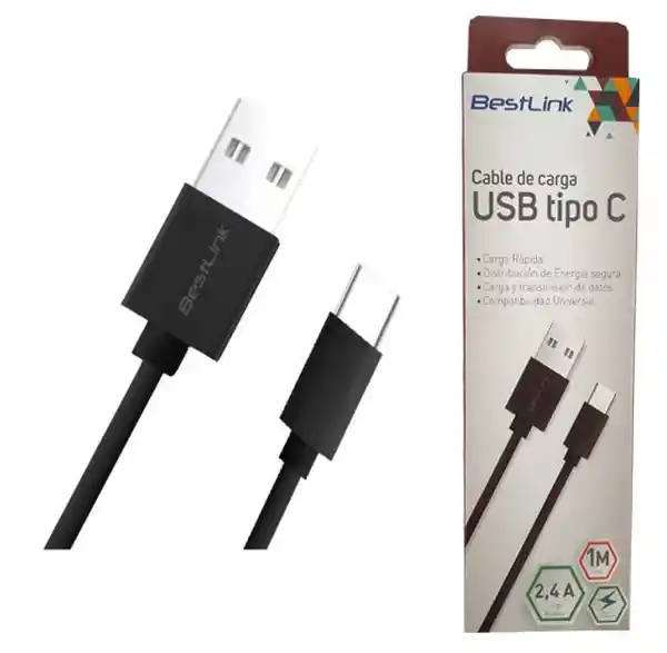 Cable de Carga Rápida de 2. 4 Amp Con Conexión Usb C. Ideal Para Cargar Sincronizar y Transferir Tus Archivos Con Tus Dispositivos Compatibles Fácil de Usar. Largo de 1 Mts Color Negro