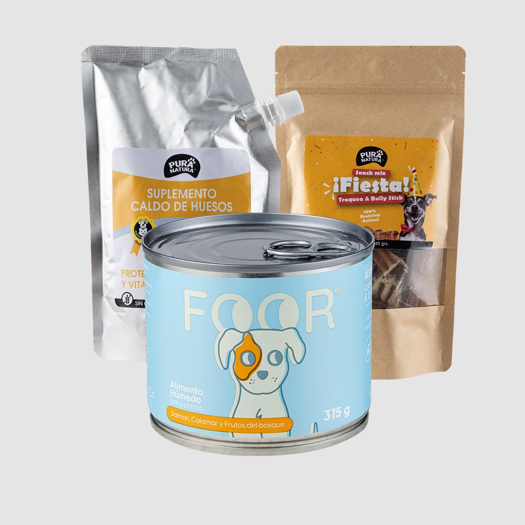 <p>Pack contiene 1 mix ¡Fiesta! Pura Natura, 1 caldo de hueso Pura Natura y 3 latas FOOR húmedo para perros.</p>