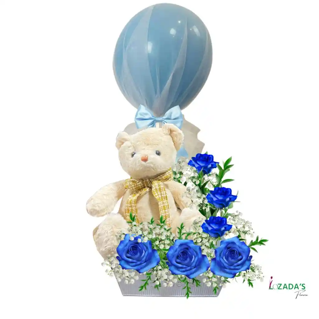 Un regalo tierno y elegante para celebrar la llegada de un niño. Este hermoso arreglo ha sido diseñado con amor y cuidado, ideal para baby showers, nacimientos o para sorprender a los nuevos padres. Incluye: Un adorable osito de peluche en tono beige con lazo decorativo, suave y perfecto para acompañar al recién nacido. Un globo azul envuelto en tul con moño satinado, que aporta un toque festivo y sofisticado. Exquisitas rosas azules acompañadas de finos detalles de gypsophila, presentadas en una elegante base blanca. Un detalle exclusivo de Lozada’s Florería, elaborado con flores importadas y materiales de la más alta calidad. Disponible para entrega en Santiago. 📏 Tamaño aproximado: 40 x 30 cm 🎁 Personalizable con tarjeta dedicatoria sin costo adicional