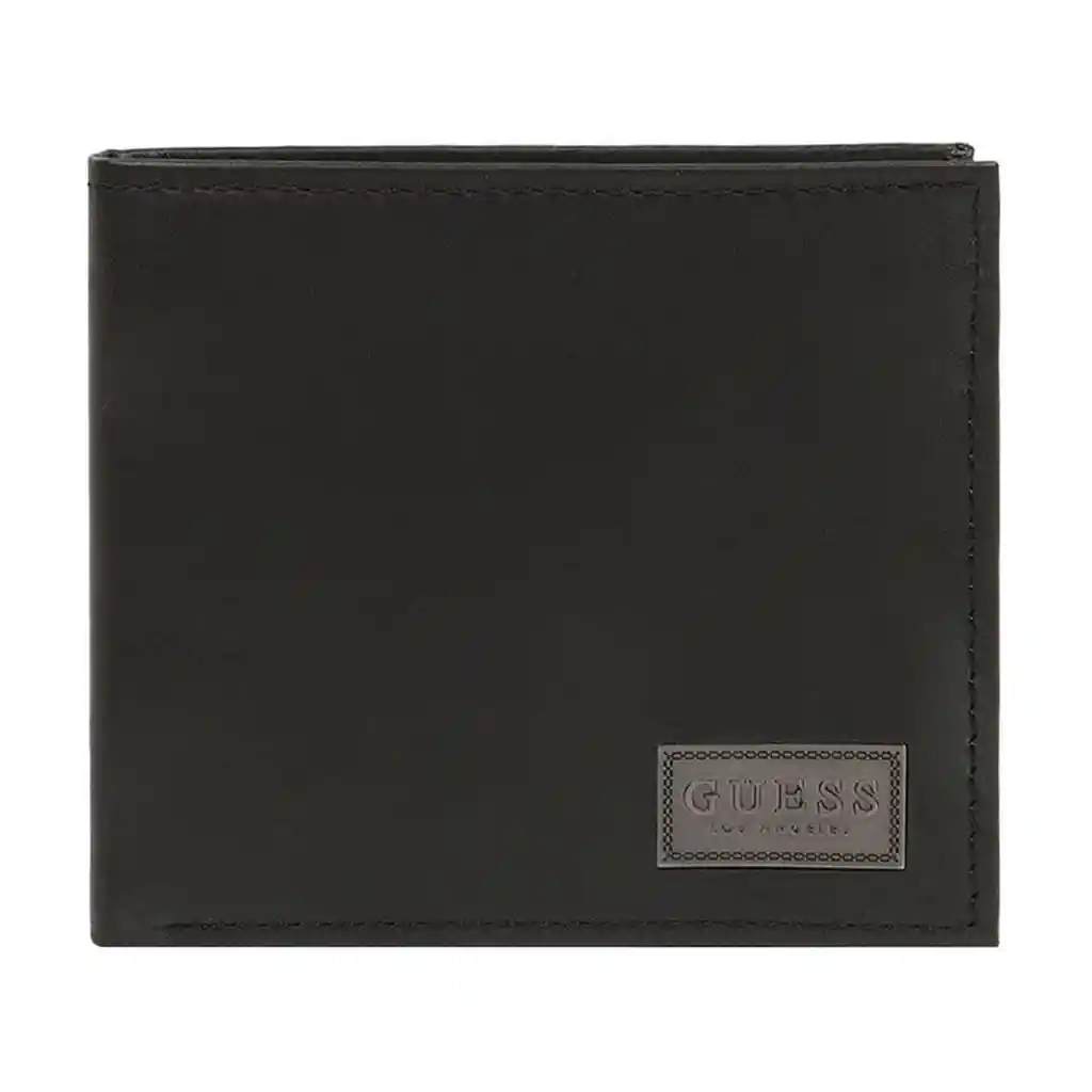 Modelo: 31GUE22096. Billetera de hombre. Diseño de tono liso clásico con aplique metalico con letras Guess en el costado inferior. Compartimientos internos diferenciados. Materiales: 100% GENUINE LEATHER.