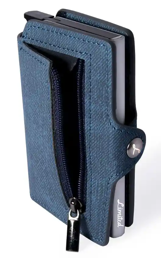 Billetera de cuero PU con tarjetero metálico anti clonación y monedero para que guardes todo en un mismo lugar. Hasta 12 tarjetas. 4 tarjetas con relieve o 6 tarjetas lisas en el interior metálico y de 4 a 6 tarjetas en los bolsillos interiores.