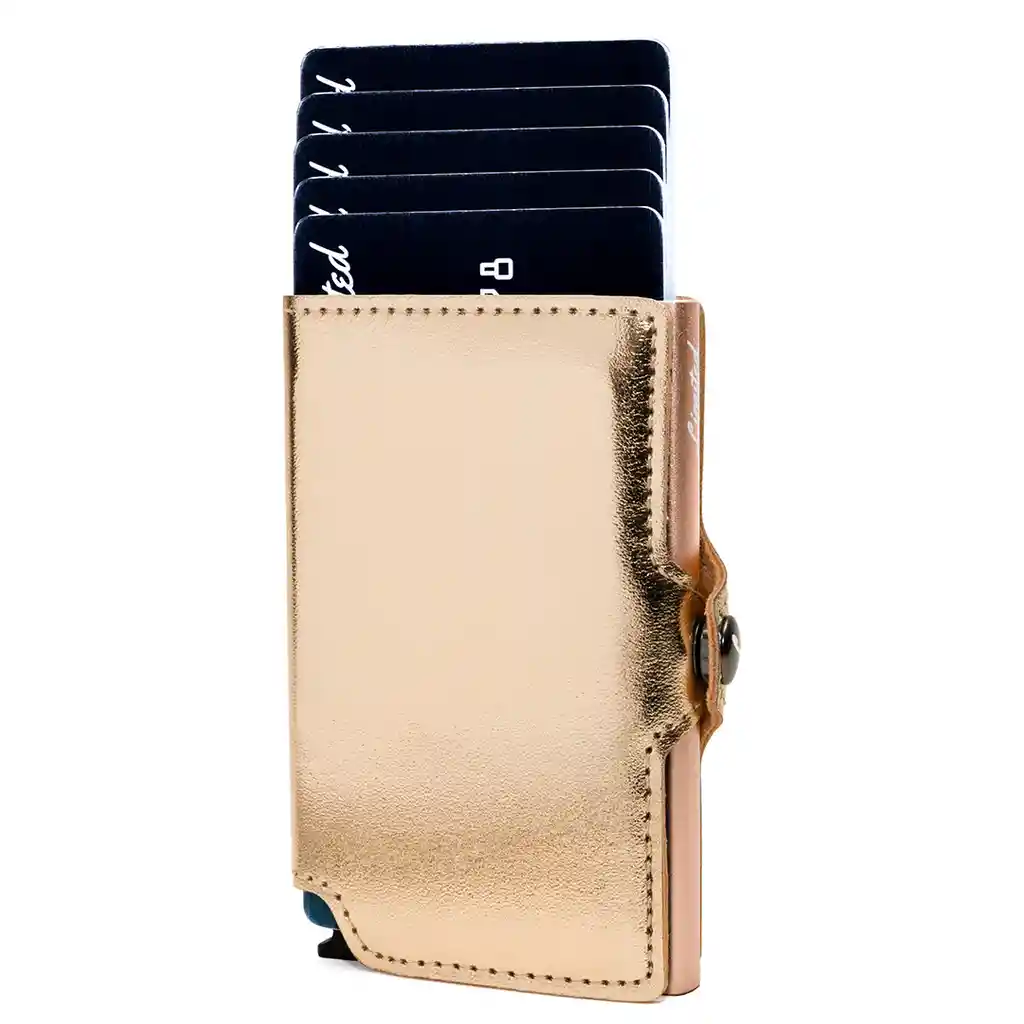 Billetera de cuero PU con tarjetero metálico anti clonación. Hasta 12 tarjetas. 4 tarjetas con relieve o 6 tarjetas lisas en el interior metálico y de 4 a 6 tarjetas en los bolsillos interiores.