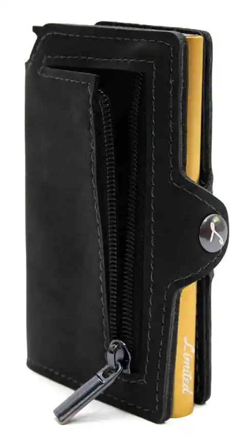 Billetera de cuero PU con tarjetero metálico anti clonación y monedero para que guardes todo en un mismo lugar. Hasta 12 tarjetas. 4 tarjetas con relieve o 6 tarjetas lisas en el interior metálico y de 4 a 6 tarjetas en los bolsillos interiores.