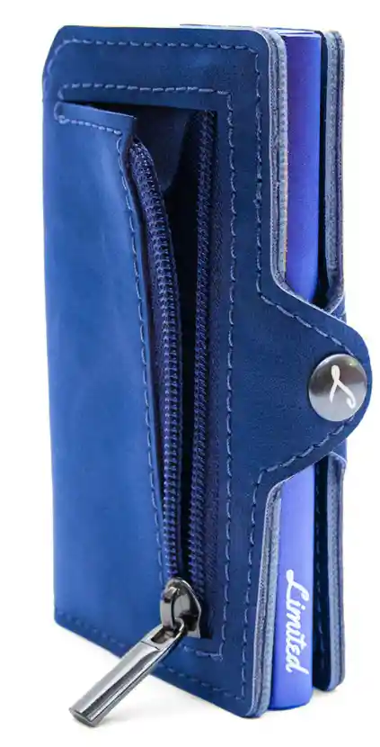 Billetera de cuero PU con tarjetero metálico anti clonación y monedero para que guardes todo en un mismo lugar. Hasta 12 tarjetas. 4 tarjetas con relieve o 6 tarjetas lisas en el interior metálico y de 4 a 6 tarjetas en los bolsillos interiores.
