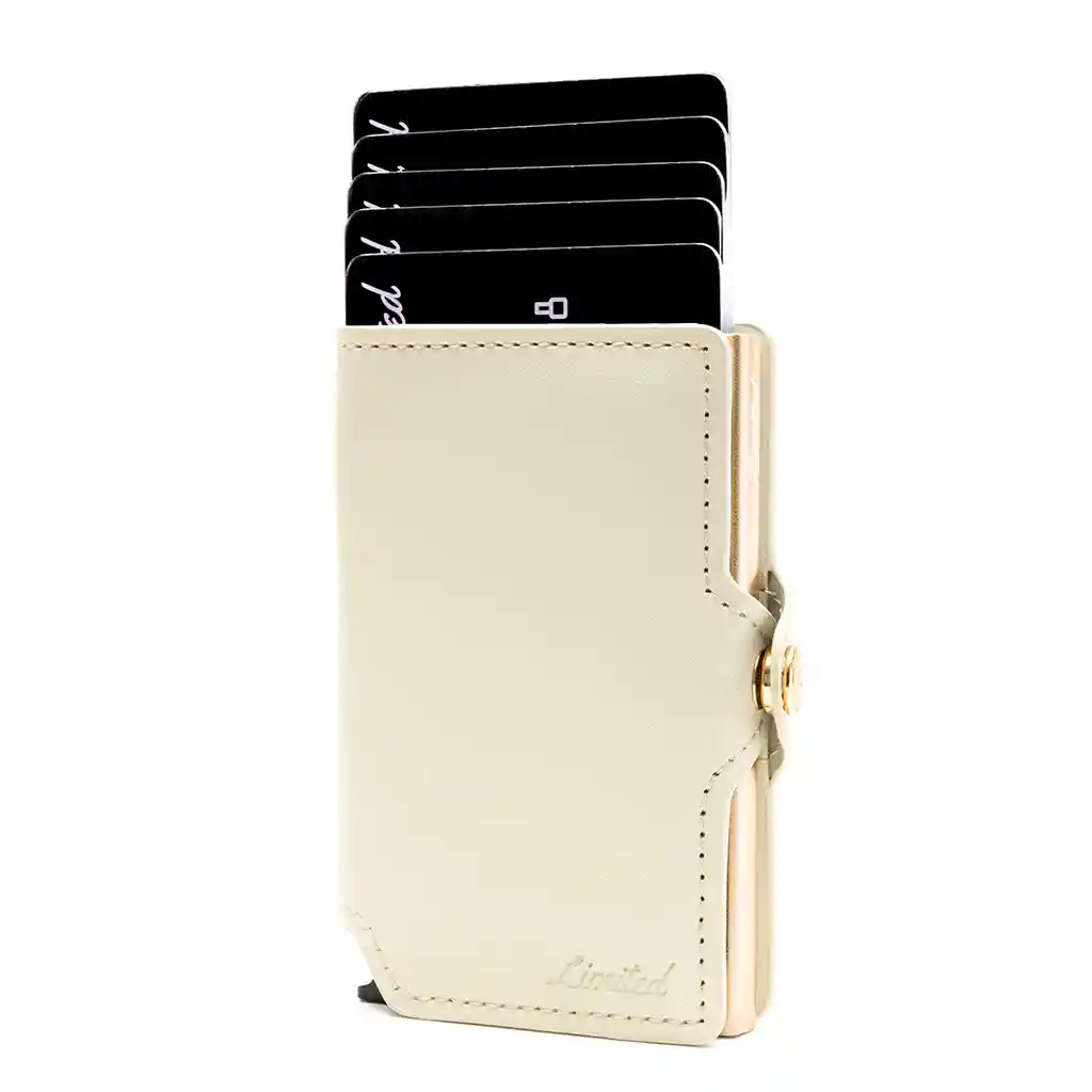 Billetera de cuero PU con tarjetero metálico anti clonación. Hasta 12 tarjetas. 4 tarjetas con relieve o 6 tarjetas lisas en el interior metálico y de 4 a 6 tarjetas en los bolsillos interiores.