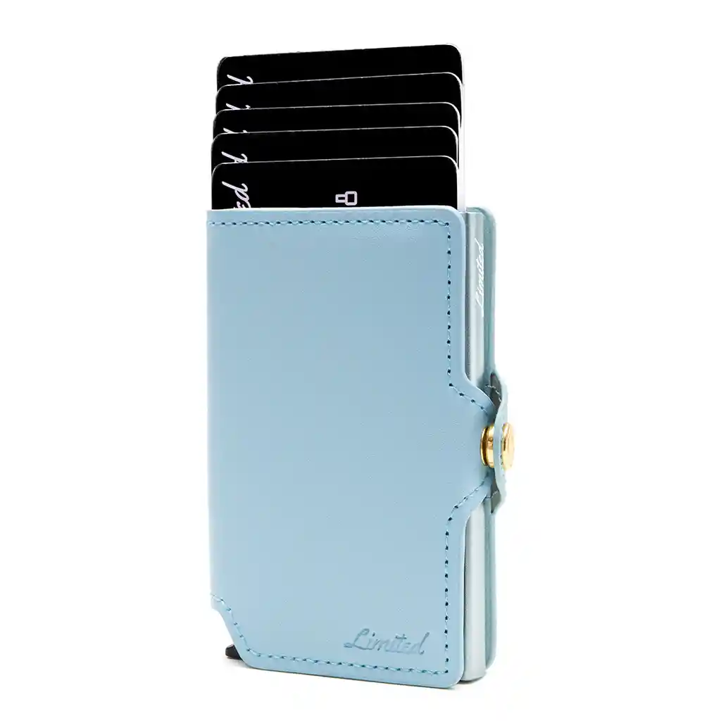 Billetera de cuero PU con tarjetero metálico anti clonación. Hasta 12 tarjetas. 4 tarjetas con relieve o 6 tarjetas lisas en el interior metálico y de 4 a 6 tarjetas en los bolsillos interiores.