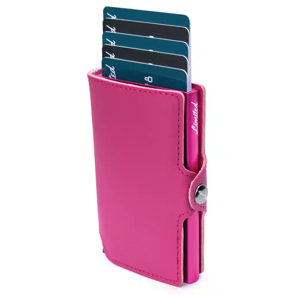Billetera de cuero PU con tarjetero metálico anti clonación. Hasta 12 tarjetas. 4 tarjetas con relieve o 6 tarjetas lisas en el interior metálico y de 4 a 6 tarjetas en los bolsillos interiores.