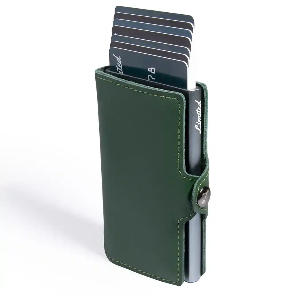 Billetera de cuero PU con tarjetero metálico anti clonación. Hasta 12 tarjetas. 4 tarjetas con relieve o 6 tarjetas lisas en el interior metálico y de 4 a 6 tarjetas en los bolsillos interiores.