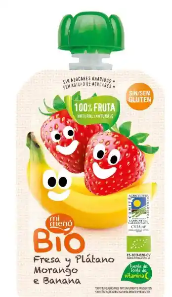 Postre bebible de fresa y plátano de origen biológico. Libre de gluten. Preparado de frutas (plátano, manzana, fresa y uva). Lactantes a partir de 4 meses y niños de corta edad. packing: Sin Packaging