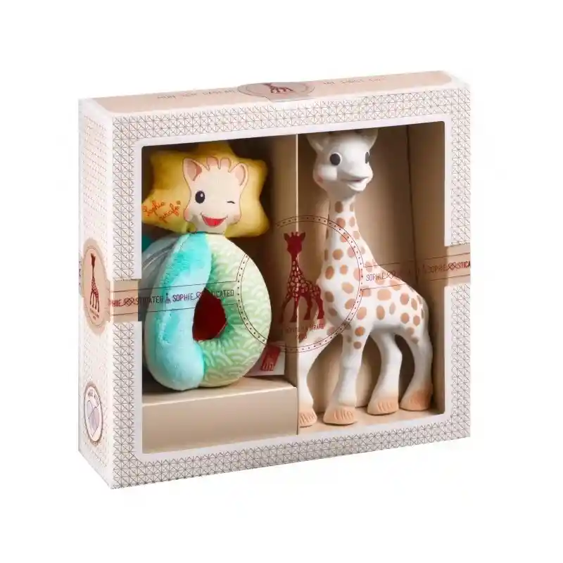 Este set incluye la famosa Sophie la girafe fabricada en caucho 100% natural y un sonajero con cuentas, a la vez suave y juguetón para mayor entretención del bebé. Para ofrecer el regalo perfecto, este set viene acompañado de una tarjeta de regalo personalizable y una bonita bolsa regalo. Tamaño: 22.5 x 21.5 * 6