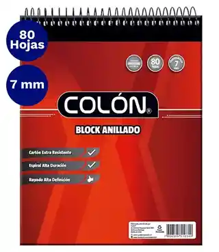 Este block anillado escolar de la marca Colón tiene un grosor de anillo de 7 mm y contiene 80 hojas. Es ideal para tomar apuntes y realizar tareas escolares. Su formato anillado facilita la escritura y el manejo de las hojas. Perfecto para estudiantes.