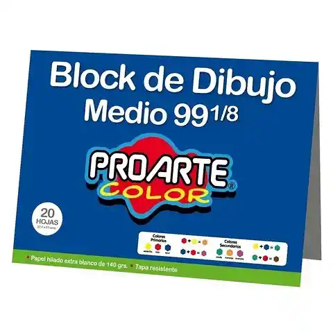 Block de Dibujo Medio N°99 1/8 20 Hojas Proarte El Block de Dibujo ProArte Medio 99 1/8 es el favorito de estudiantes, artistas y amantes del dibujo gracias a su excelente calidad y resistencia. Incluye 20 hojas de papel hilado extra blanco de 140 gramos, ideal para trabajos escolares, bocetos, ilustraciones y técnicas de dibujo seco. Características destacadas -20 hojas de alta calidad -Formato 37.7 x 27 cm -Papel hilado extra blanco 140 g/m², perfecto para lápiz, grafito, carbón, pastel seco y marcadores base agua -Portada resistente con guía de colores primarios y secundarios -Ideal para uso escolar, artístico o creativo Este block ofrece hojas firmes y lisas que garantizan trazos más definidos y colores más intensos, convirtiéndose en una herramienta esencial para cualquier estudiante o artista.