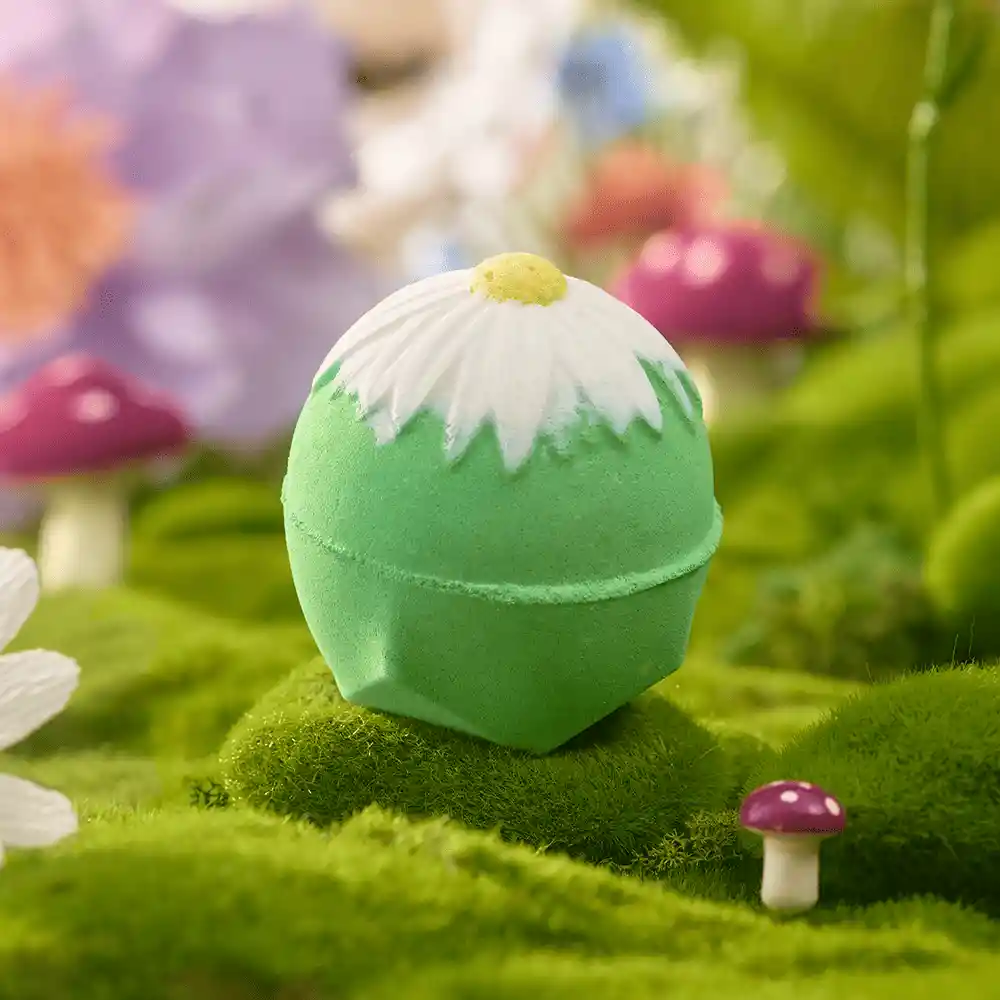 La bomba de baño Blooming Beautiful Grass llena tu tina de frescura con sándalo, nerolí y un toque verde relajante.