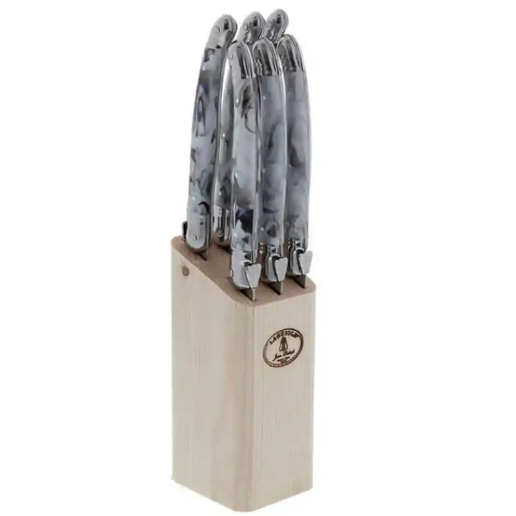 Bloque 6 Cuchillos Dark Grey Laguiole Jean Dubost Moderno, elegante y lleno de carácter, el Bloque de 6 Cuchillos Dark Grey de Laguiole Jean Dubost destaca por su sofisticado marmoleado gris, una tonalidad profunda que aporta estilo contemporáneo y distinción a la mesa. Diseñados como cuchillos de carne para mesa, ofrecen un corte preciso y fluido que realza cada comida, convirtiendo cada encuentro en una experiencia cuidada hasta el último detalle. Fiel a la tradición cuchillera francesa, Laguiole Jean Dubost ha construido su prestigio generación tras generación, combinando excelencia en el trabajo del acero, diseño refinado y una herencia que transforma cada pieza en símbolo de calidad. Presentados en un bloque de madera, mantienen tus cuchillos organizados y protegidos, mientras aportan un acento decorativo sobrio y elegante a tu comedor o cocina. Características Marca: Laguiole Jean Dubost Origen: Francia Material: Acero inoxidable Mango: Resina marmoleada color gris (Dark Grey) Uso: Cuchillos de carne para mesa Presentación: Bloque de madera Cantidad: 6 cuchillos Apto para lavavajillas