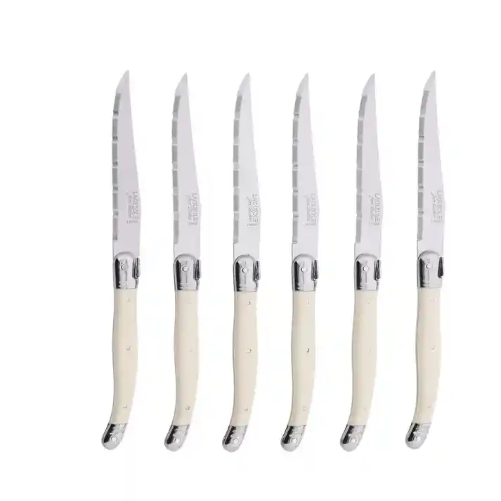 Bloque 6 Cuchillos Ivory Laguiole Jean Dubost Elegancia atemporal y tradición francesa se unen en este sofisticado bloque de 6 cuchillos Ivory de Laguiole Jean Dubost. Su delicado tono marfil aporta luminosidad y distinción a la cocina, convirtiendo un utensilio cotidiano en un verdadero elemento decorativo. Cada cuchillo está diseñado para ofrecer precisión, equilibrio y comodidad en el uso diario, reflejando la herencia cuchillera francesa que ha dado prestigio a la marca durante generaciones. Laguiole Jean Dubost representa una tradición familiar marcada por la excelencia en el trabajo del acero, combinando historia, calidad y diseño en cada pieza. Presentados en un bloque de madera, estos cuchillos no solo mantienen el orden y la protección adecuada, sino que elevan el estilo de tu espacio con una presencia refinada y armoniosa. Características Marca: Laguiole Jean Dubost Origen: Francia Material: Acero inoxidable Mango: Resina Presentación: Bloque de madera Cantidad: 6 cuchillos Apto para lavavajillas