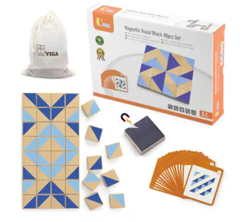 Estos bloques magnéticos invitan a los mas pequeños a conocer los tangram de una forma muy divertida. Incluye 20 cartas con ejemplos para que los niños y niñas diseñen siguiendo un patrón. Este juego estimula la coordinación mano-ojo y el desarrollo de habilidades cognitivas variadas. En la reproducción de las imágenes de las cartas los niños y niñas aprenden a modelar patrones y organizar espacialmente lo que ven mientras que a su vez pueden crear sus propios diseños dejando volar su imaginación. Incluye 40 bloques contenidos en una bolsa de genero fácil de lavar. 5 cm aprox cada pieza.