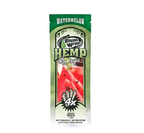 Blunt Hemp Wrap x 4 Unidades Hecho de Cañamo 4 Unidades por sobre. Sabor: Watermelon (Sandia) Incluye 4 Boquillas pre Enroladas. Sin Tabaco, Sin Nicotina. Cierre Ziploc.