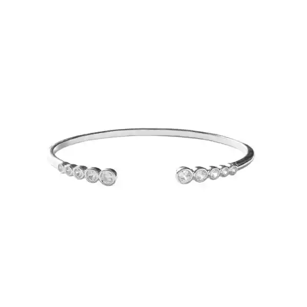 La Esclava es Una Pulsera Tradicional Que le Suma Elegancia a Quien la Usa. Se Puede Usar Sola Para Combinar Con Estilos Sencillos o se Puede Usar Con Otras Pulseras Para Crear un Outfit Mucho Más Llamativo. Nuestra Esclava Con Baño de Oro Blanco Tiene un Diseño Particular Adornado Con Circones en Sus Extremos Para Agregar un Toque Único. Diámetro: 65 cm Material: Baño de Oro Blanco.