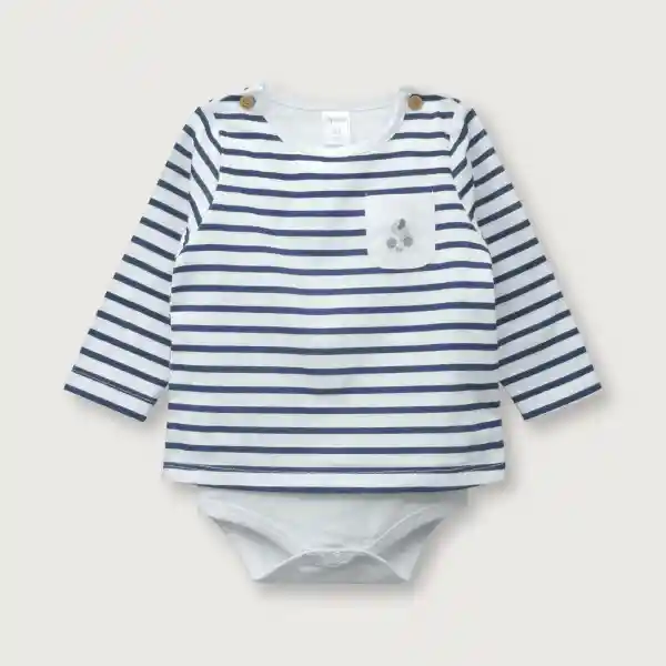Polera en Color Blanco Con Lineas Azules Bolsillo en Costado Del Pecho Botones en Hombros Para Una Facil Postura y Broches en Entrepiernas.