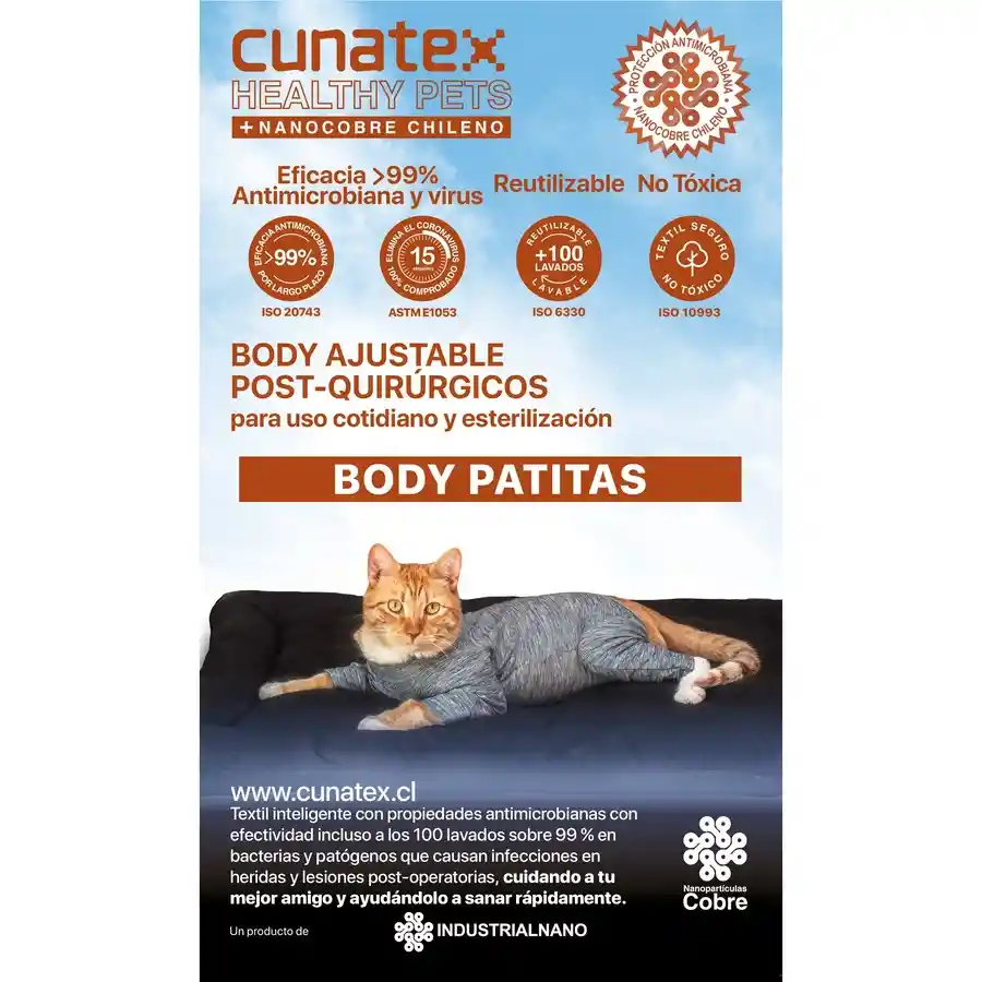 Body curativo con nanopartículas de cobre bajo "Medical device Compliance" (ISO 10993) suave al tacto y cómodo para tu mascota para uso cotidiano y post operatorio capaz de eliminar sobre 99% de bacterias, hongos y patógenos que causan infecciones en heridas y lesiones post operatorias, cuidando a tu mejor amigo y ayudándolo a sanar rápidamente, evitando infecciones por contacto con otras superficies. Mantiene sus propiedades antimicrobianas prácticamente intactas incluso a los 100 lavados gracias a la nanotecnología de cobre. Informarción de tallas: Talla 00 para gatos hasta 1.5 kg Talla 0 para gatos de 1.5 a 2.5 kg Talla 1 para gatos de 2.5 a 3.5 kg Talla 2 para gatos de 3.5 a 4.5 kg Talla 3 para gatos de 4.5 a 5.5 kg Talla 4 para gatos de 5.5 a 6.5 kg Talla 5 para gatos de 6.5 a 7.5 kg