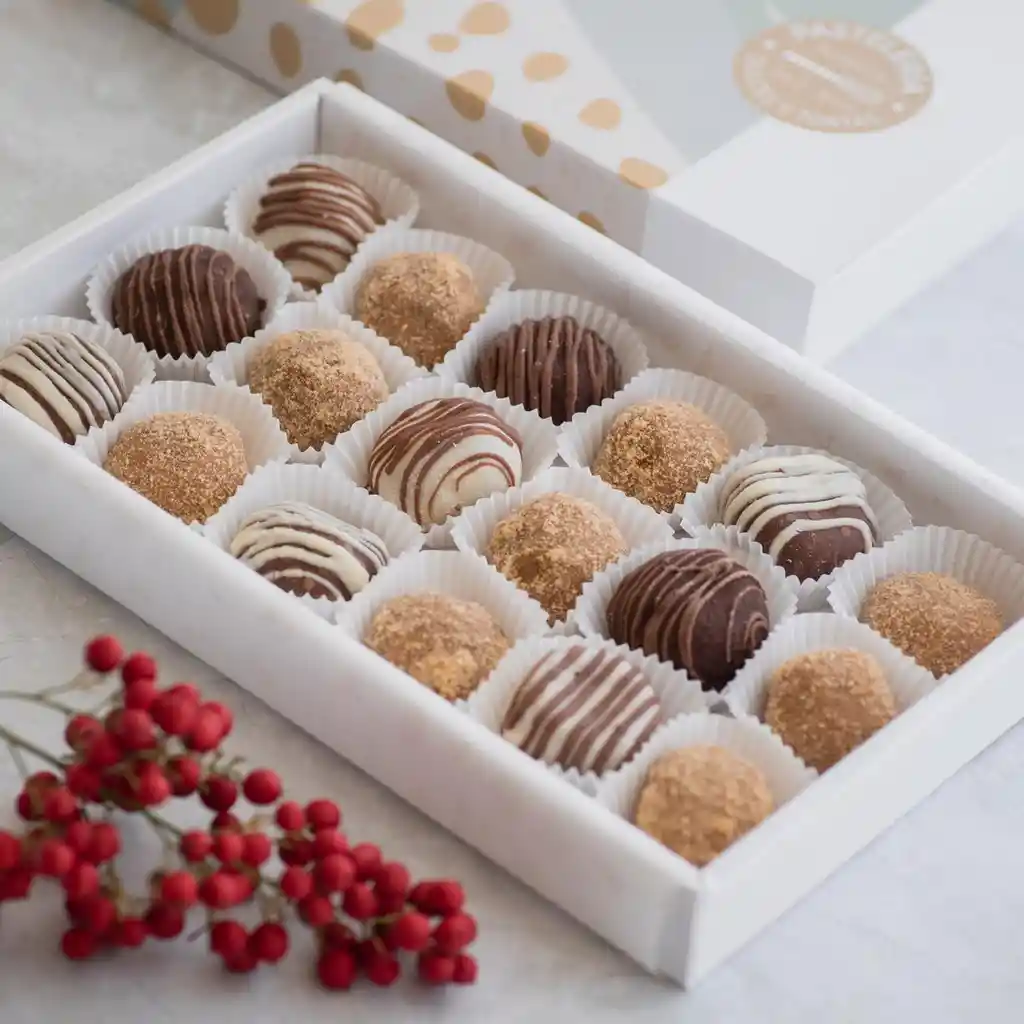 Caja con 18 Bolitas de Miga y Caluga, mix de bolitas empolvadas y bañadas en chocolate leche, blanco y negro. Perfectas para regalar o compartir!