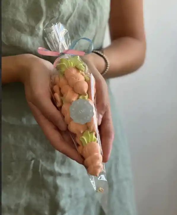 Deliciosos merenguitos con forma de zanahoria, ideales para celebrar la Pascua. Presentación en bolsa de 45 gr, perfectos para disfrutar en cualquier momento.