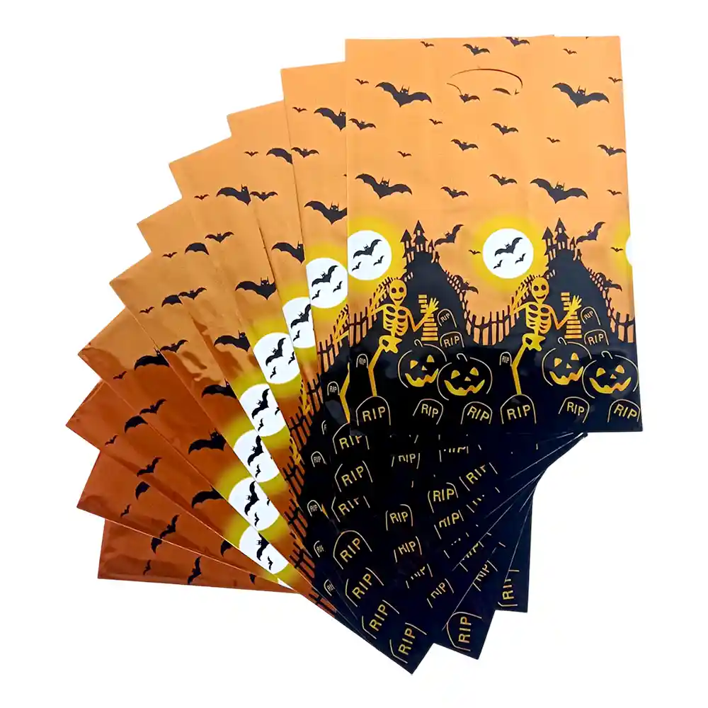 ¡Endulza tu fiesta de Halloween con estas bolsas metálicas con diseño de casa embrujada! Perfectas para repartir dulces, sorpresas o pequeños recuerdos en tus celebraciones. Coloridas y temáticasCon diseño de calabaza clásico de Halloween y acabado metalizado que brilla y llama la atención, estas bolsas son ideales para complementar tu decoración y dar un toque festivo a tu fiesta. Prácticas y resistentesFabricadas en material metalizado de buena calidad, ligeras, duraderas y fáciles de llenar, perfectas para que los niños disfruten de sus dulces sin preocuparse por que se rompan. Beneficios Pack de 10 bolsas con diseño de calabaza Material resistente y reutilizable Ideal para fiestas, dulces y recuerdos Tamaño perfecto para golosinas y pequeños juguetes Detalles técnicos Cantidad: 10 unidadesMaterial: MetalizadoMedida: Aproximada según estándar de bolsa dulce Haz que tus fiestas de Halloween sean más divertidas con estas bolsas de calabaza! PÃdelas ahora y recÃbelas en la puerta de tu casa. 👻ðŸ¬ðŸ•¸ï¸