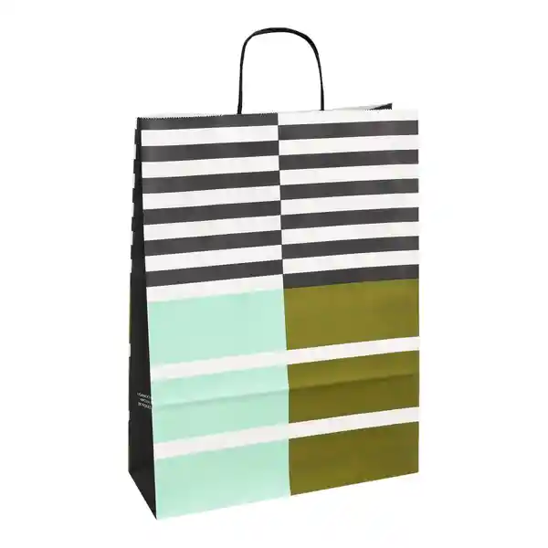 De Papel Kraft Blanco 100 g Con Diseño Impreso y Asas de Papel Retorcido. Tiene un Tamaño de 30 x 10 x 41 cm