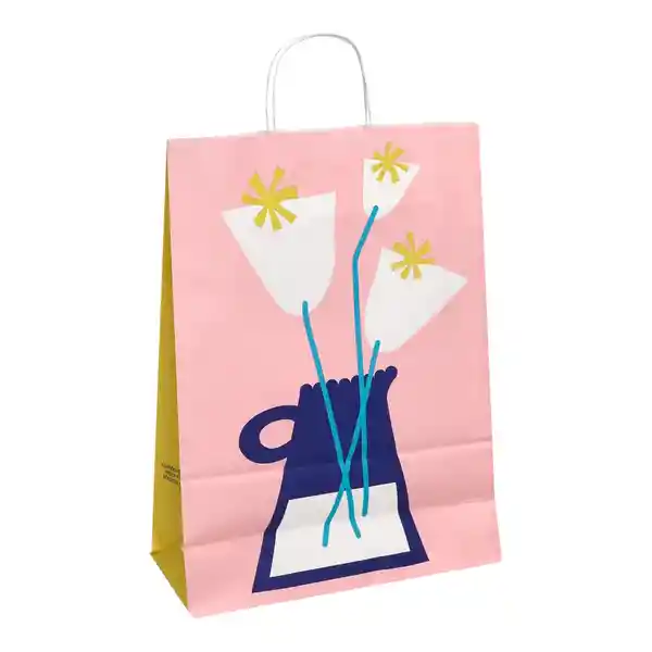 De Papel Kraft Blanco 100 g Con Diseño Impreso y Asas de Papel Retorcido. Tiene un Tamaño de 30 x 10 x 41 cm