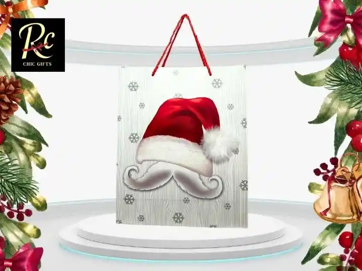 Bolsa Regalo Gorro Santa Bigote Xl 30x40cm Pompón Relieve - Regalos Chic