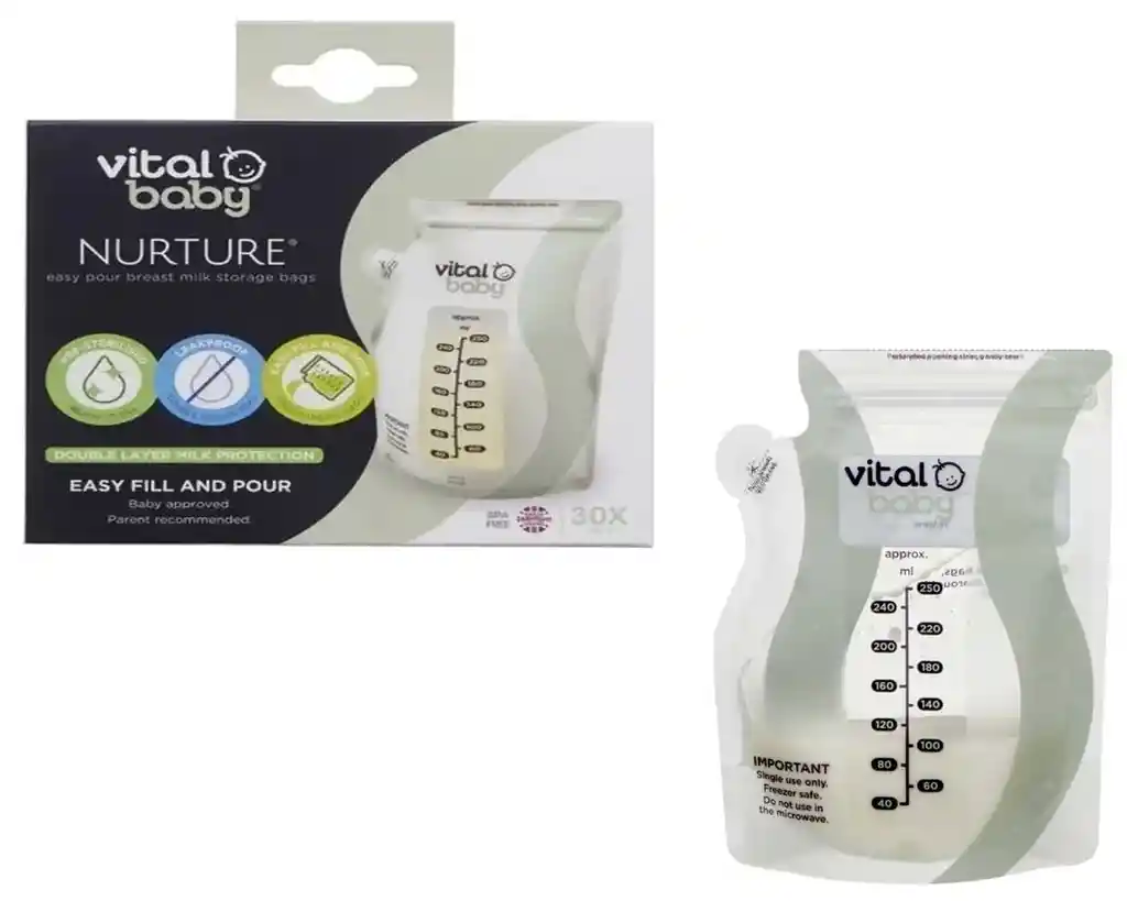 Bolsas Para Almacenar Leche Materna 30 pcs Vital Baby. Preesterilizadas y listas para usar. Las bolsas de almacenamiento de leche materna Vital Baby son perfectas para almacenar de forma segura cada gota de leche extraída. Características: El sello seguro a prueba de fugas garantiza que no se pierda leche cuando se almacena en el refrigerador o congelador. Su cuello ancho y base independiente hacen que cada bolsa sea fácil de llenar. Simplemente retire la pestaña preperforada cuando esté listo para llenar la bolsa. Luego vierta su leche materna recién extraída con facilidad y bloquee de forma segura la frescura en la bolsa con el cierre de cremallera fácil de usar. Volver a abrir la bolsa simplemente cortando a lo largo de la línea punteada, asegura que su valiosa leche materna no se vierta sobre la cremallera de sellado que se manipuló durante el llenado. Esto evita la posible contaminación y mantiene un alto nivel de higiene, fácil y sin esfuerzo. Hay 30 bolsas de 250 ml en cada caja, por lo que siempre puede tener leche materna a mano cuando la necesite.