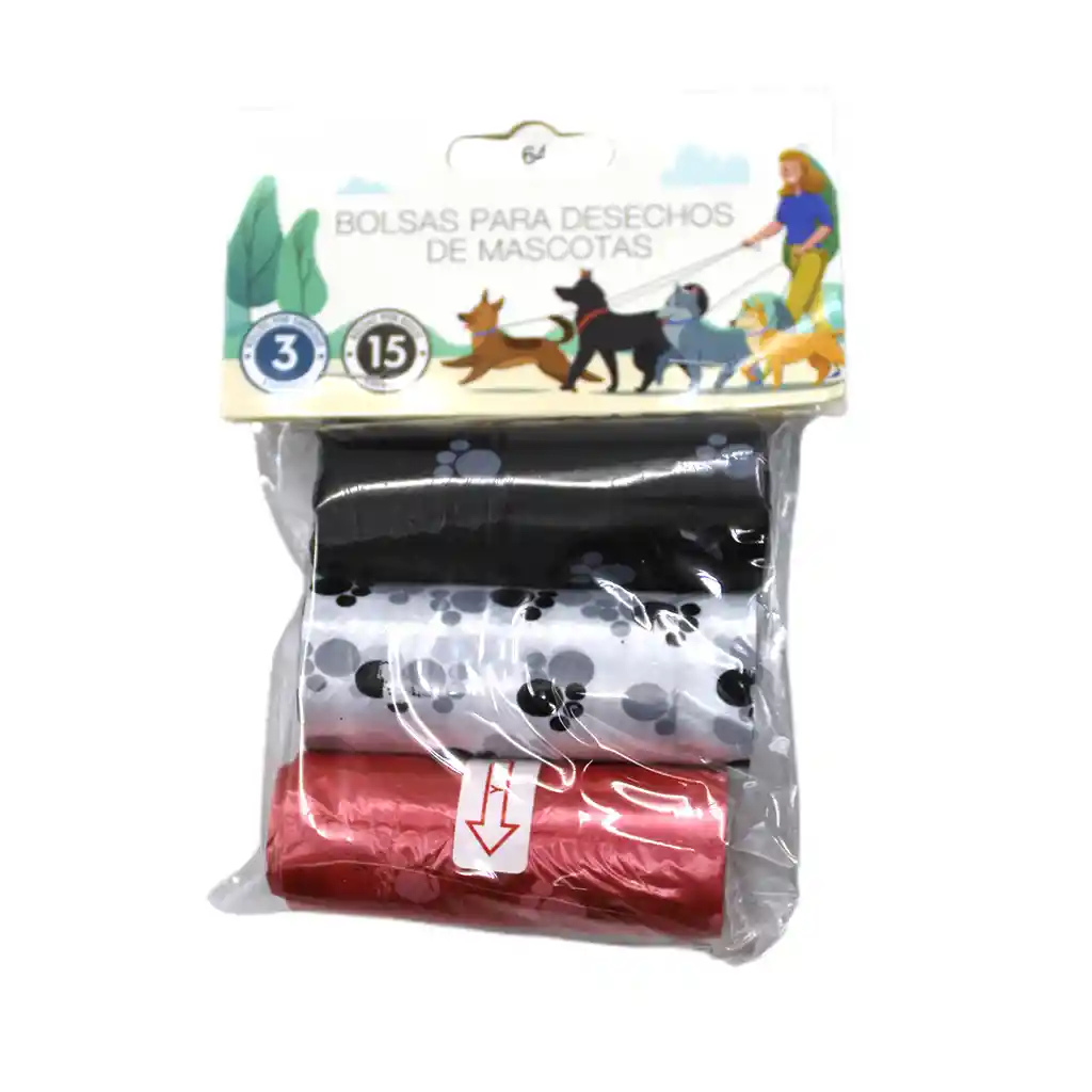 BOLSAS PARA DESECHOS DE MASCOTAS, 3 ROLLOS, DIFEERENTES COLORES