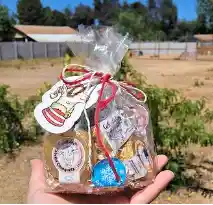 Bolsita navideña de cabrita alegre, con 5 variedades de bombones. Sin gluten, 56% de cacao, leche de cabra, manjar de cabra, mani.
