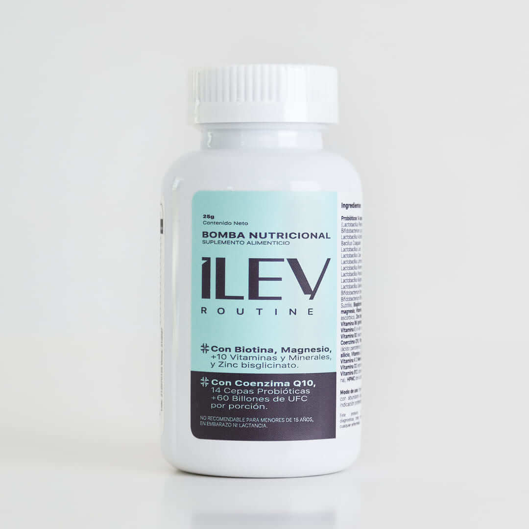 🟣 Reduce el impacto del estrés🟣 Frena la caída del pelo🟣 Incentiva el crecimiento de pelo fortalecido🟣 Activa un buen funcionamiento intestinal🟣 Previene y mejora el acné🟣 Te ayuda a cicatrizarLa Bomba Nutricional es un suplemento alimenticio con una combinación única de ingredientes cuidadosamente seleccionados para fortalecer el cabello, la piel, las uñas y la mente, desde la microbiota intestinal hasta el sistema nervioso e inmunológico.¿Cómo se consume?Te recomendamos tomar una cápsula al día en horas de la mañana, junto al desayuno y con abundante agua, esto le dará al intestino una base de nutrientes para iniciar el día. Para evitar que se oxiden o cambien de color, guarda las cápsulas en un lugar fresco y seco (15-25 °C preferiblemente), lejos de la luz, el calor y la humedad.¿Estás en embarazo, lactancia o eres menor de 15 años?En nuestro país, Chile, la Coenzima Q10 está categorizada como Alimento para deportistas y por lo tanto, no podemos recomendar el consumo de la Bomba Nutricional a personas en embarazo, en lactancia o menores de 15 años.Beneficios en la caída del peloMuchos problemas de alopecia y acné sanan con mayor capacidad al disminuir la inflamación de los folículos pilosos, la Bomba te aporta una dosis diaria perfecta de micronutrientes para fortalecer el sistema inmune, es decir, que tu cuerpo adquiere mayores capacidades para combatir las agresiones externas y al mismo tiempo proteger el equilibrio interno.Beneficios en el sueño y ciclos de reparaciónEl descanso y la tranquilidad serán estados más frecuentes al aportar a tu cerebro dosis de magnesio, vitamina B12, B6, K y otros minerales que le permiten al sistema nervioso cumplir su función reguladora, esto podría ayudar también con procesos de digestión, sueño, estrés o ansiedad.Beneficios en la pielEl fortalecimiento del cabello, la piel y las uñas sucede con mayor facilidad al contar con suficientes vitaminas A, E y del complejo B como la Biotina, que al mezclarse con la Coenzima Q10 maximiza la capacidad regenerativa del propio cuerpo.Beneficios digestivosAl mejorar la microbiota intestinal también podrás mejorar otros factores de salud relacionados al metabolismo, síndrome de ovarios poliquísticos, depresión, sueño o sobrepeso, pero te aseguramos que los resultados exitosos no solo dependen de consumir un suplemento alimenticio sino también, de llevar una dieta adecuada. para tu cuerpo, hacer actividad física, cuidar tu higiene capilar y sostener buenas prácticas para la salud mental.Beneficios adicionalesEl intestino tendrá una mejora constante gracias a la delicada selección de las 14 cepas probióticas que facilitan la regulación celular, ya que el 70% aproximadamente de las células del sistema inmune se alojan alrededor del intestino, es decir, si tu intestino está sano, podrás combatir con mayor fuerza enfermedades y virus.