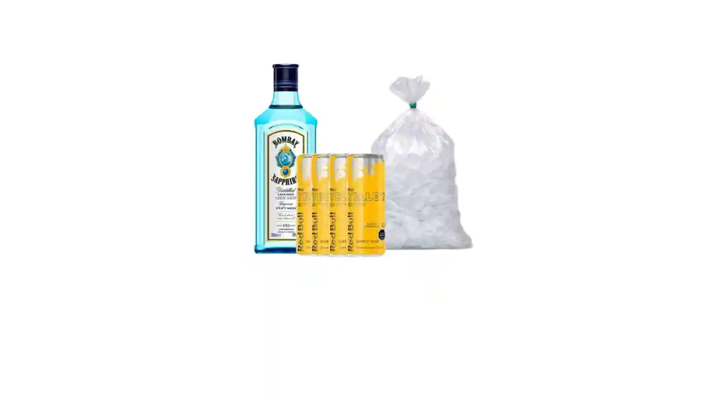 BOMBAY SAPPHIRE GIN 47º 750 ML + 4 REDBULL AMARILLAS + HIELO 1KG
