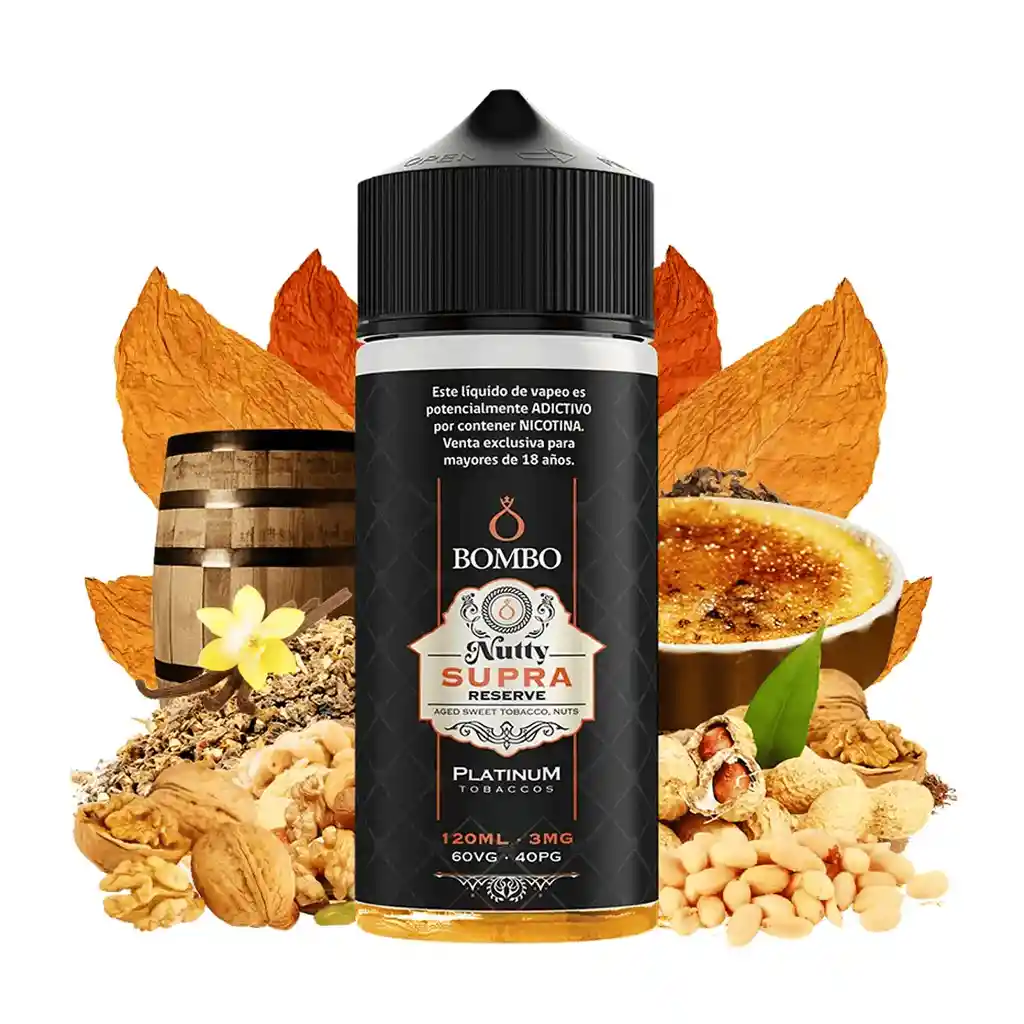 Bombo Nutty Supra Reserve 120 ml Tabaco dulce con crema de frutos secos y matices acaramelados, una mezcla sofisticada que combina tabaco rubio, caramelo y frutos secos tostados, ideal para quienes buscan un sabor gourmet y equilibrado. Detalles del Producto Volumen: 120 ml Nicotina: 3 mg/ml Perfil de sabor: Tabaco dulce, frutos secos (avellanas, nueces), caramelo, crema de frutos secos, matices tostados/acaramelados