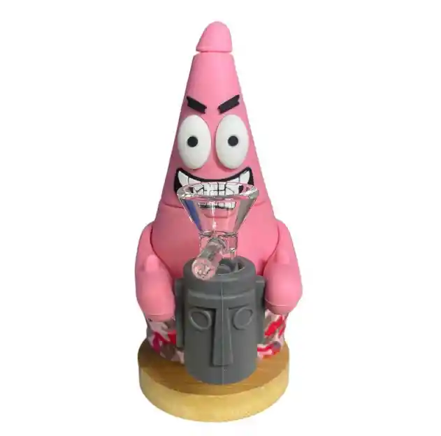 Divertida pipa estilo bong de Patricio Estrella de la serie Bob Esponja, tiene pantalones de tela. Con quemador de 14 mm que está insertado dentro de la casa de Calamardo. Tamaño aproximado: 16 cm.