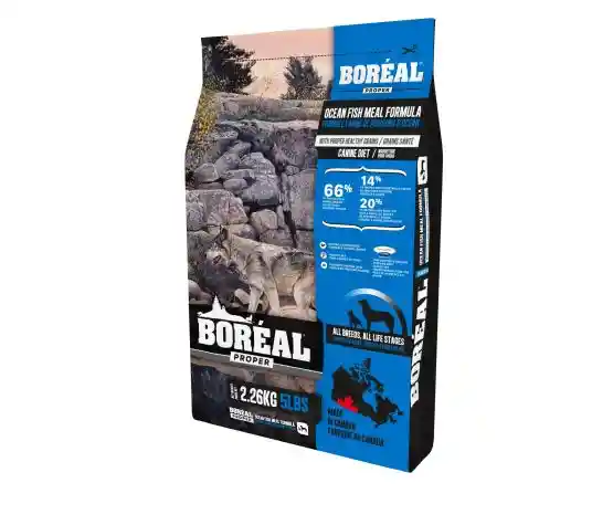 Boréal Proper Ocean FIsh es un alimento a base de cereales con bajo contenido en carbohidratos. Los ingredientes ricos en almidón pueden provocar aumento de peso y obesidad. Una alternativa a una dieta sin cereales es elegir alimentos que no contengan cereales con alto contenido de azúcar, como el maíz y el trigo. El bajo índice glucémico de la avena y la cebada cortadas en acero, provenientes de la región agrícola menonita del centro de Ontario, así como el bajísimo índice glucémico de los guisantes y los frijoles blancos, los convierten en ingredientes fantásticos. Además, la avena y la cebada cortadas en acero se cultivan localmente y tienen una excelente relación calidad-precio. Son una fuente importante de vitaminas, minerales, aceites esenciales, fibra y proteínas. Los alimentos para perros Proper contienen solo una fuente de proteína de carne para facilitar la digestión y reducir el riesgo de alergias. Estos alimentos se conservan de forma natural y no contienen papa, trigo ni maíz. El alimento para perros Boréal utiliza AvailaPet, una colección especial de minerales unidos a aminoácidos para que sean biodisponibles. El zinc orgánico de AvailaPet se absorbe fácilmente y es esencial para una piel y un pelaje sanos.