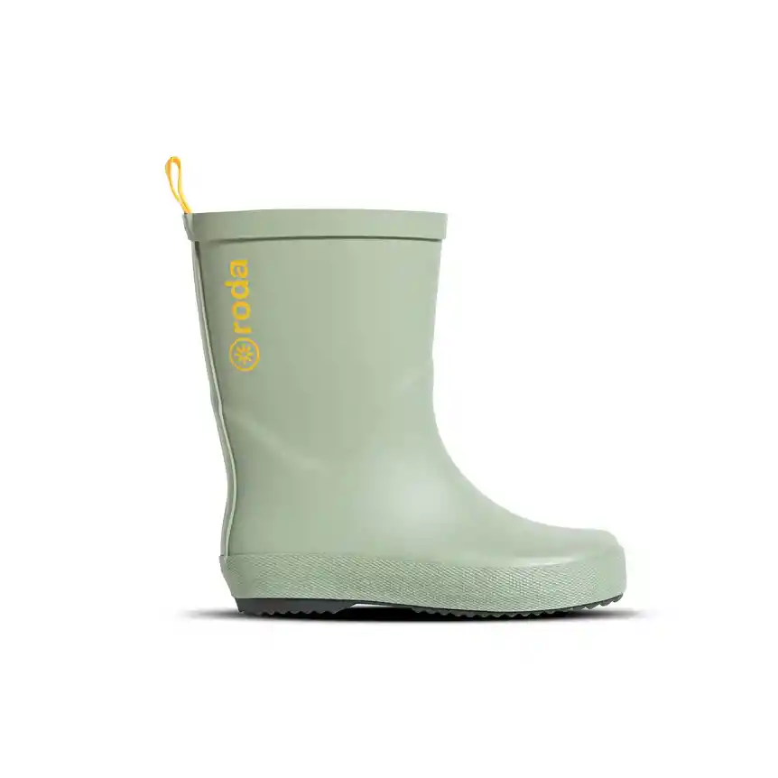 Botas de Agua Para Niños Roda – Sage. ¡Que el clima no l@s detenga! Perfectas para usar en días de lluvia, jugar afuera, caminar por la ciudad o en embarrados caminos. No importa el panorama, nuestras Botas de agua RODA les darán la libertad para explorar su mundo asegurando diversión y comodidad mientras lo hacen. Características: Flexibilidad Garantizada. Su exterior de goma natural que junto a su interior de algodón y polyester aseguran una cómoda adaptación al movimiento de los pies. Terminación Mate. Elegante y duradera terminación sin brillo que queda bien con todas las tenidas! Suela Antideslizante. Diseño creado especialmente para un buen agarre en cualquier superficie. Fácil Postura. En la parte posterior cuenta con una cinta que ayuda a que el ponerse las botas sea muy fácil.