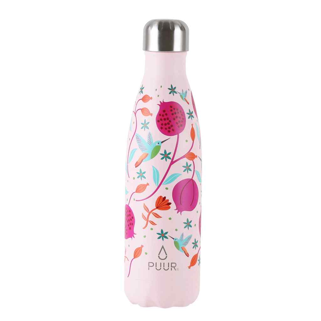 <p>Llena de colores es nuestra botella térmica Puur Bottle Granada. Esta botella de 500 ml. celebra la exuberancia de las flores, sus frutos y la vitalidad de los colibríes. Es 100% hermética y su capacidad para mantener tus bebidas a la temperatura ideal se debe a su triple pared de acero inoxidable 304 y una capa de cobre en su interior, siendo la compañera perfecta para tus días llenos de actividades. Descripción: Botella térmica de doble pared de acero inoxidable 304 (grado alimento) que mantiene la temperatura de los líquidos hasta 24 horas fríos y 12 horas calientes. Libres de BPA.Dimensiones: 27 cm de alto x 7 cm de diámetro y 300 gr. de peso (aproximadamente).Lavar con agua tibia y lavaloza, secar destapada. Precaución: no sobre rellenar la botella con líquidos calientes, podría causar quemaduras al abrirla. No introducir al microondas, refrigerador y freezer. No sobre rellenar con líquidos carbonatados.</p>