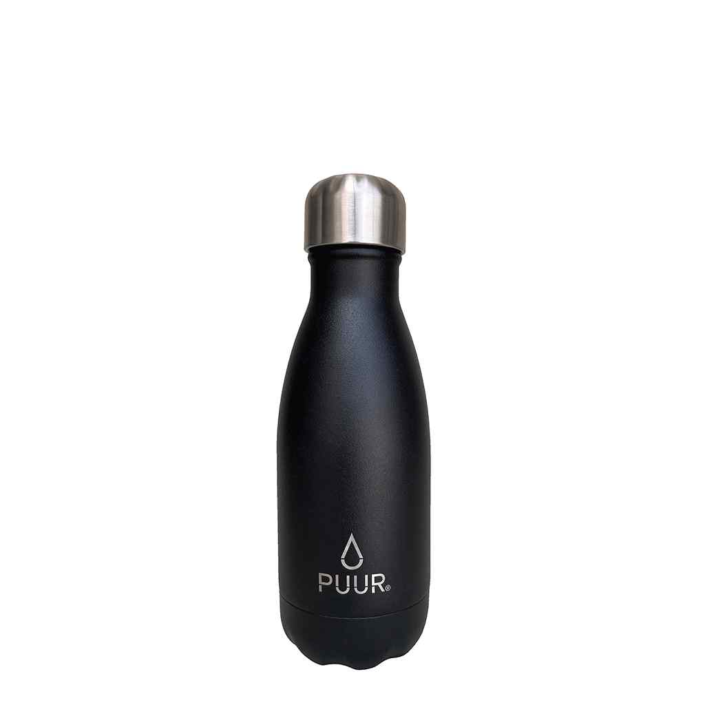 <p>Tamaño perfecto para llevarla en la cartera incluso en un bolsillo, así es nuestra nueva Puur Bottle Onyx 260ml. de acabado negro mate suave al tacto, ya no tienes excusas para no hidratarte! . Descripción: Botella térmica de doble pared de acero inoxidable 304 (grado alimento), más una capa de cobre en su interior que mantiene la temperatura de los líquidos hasta 24 horas fríos y 12 horas calientes. Libres de BPA, no se condensa y reutilizable.Dimensiones: 27 cm de alto x 7 cm de diámetro y 250 gr. de peso (aproximadamente).Lavar con agua tibia y lavaloza, secar destapada. Precaución: no sobre rellenar la botella con líquidos calientes, podría causar quemaduras al abrirla.</p>