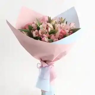 Bouquet con seis (06) Rosas Importadas y Astromelias envueltas en papel y cinta.