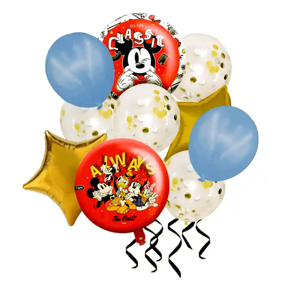 Cantidad: 12 globos Tipos: Lisos, metalizados y con confetti Material: Látex y Foil Colores: Tonos clásicos de Mickey